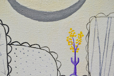 "La Mesa servida" es eso, un altar, un recordatorio de lo que me emocionó ver, la apología a las superficies planas y horizontales de Mariuca, a su mundo colorido y cubierto por niebla o nubes. A los objetos cotidianos que bajo su pincel, se llenan de significados. Arriba del todo recordando su magia, coloqué la media luna que debía ser negra, pero seguro que ella la hubiera hecho gris.